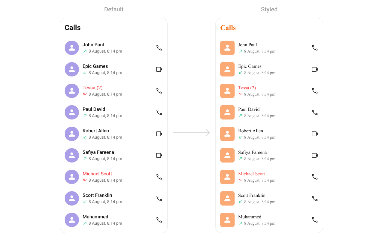 TheCometChatCallLogs Component provides a list of recent calls (voice or video), showing details like call type, duration, participants, and timestamps. Developers can style text, icons, and background elements, making it easy to match the app’s design system.