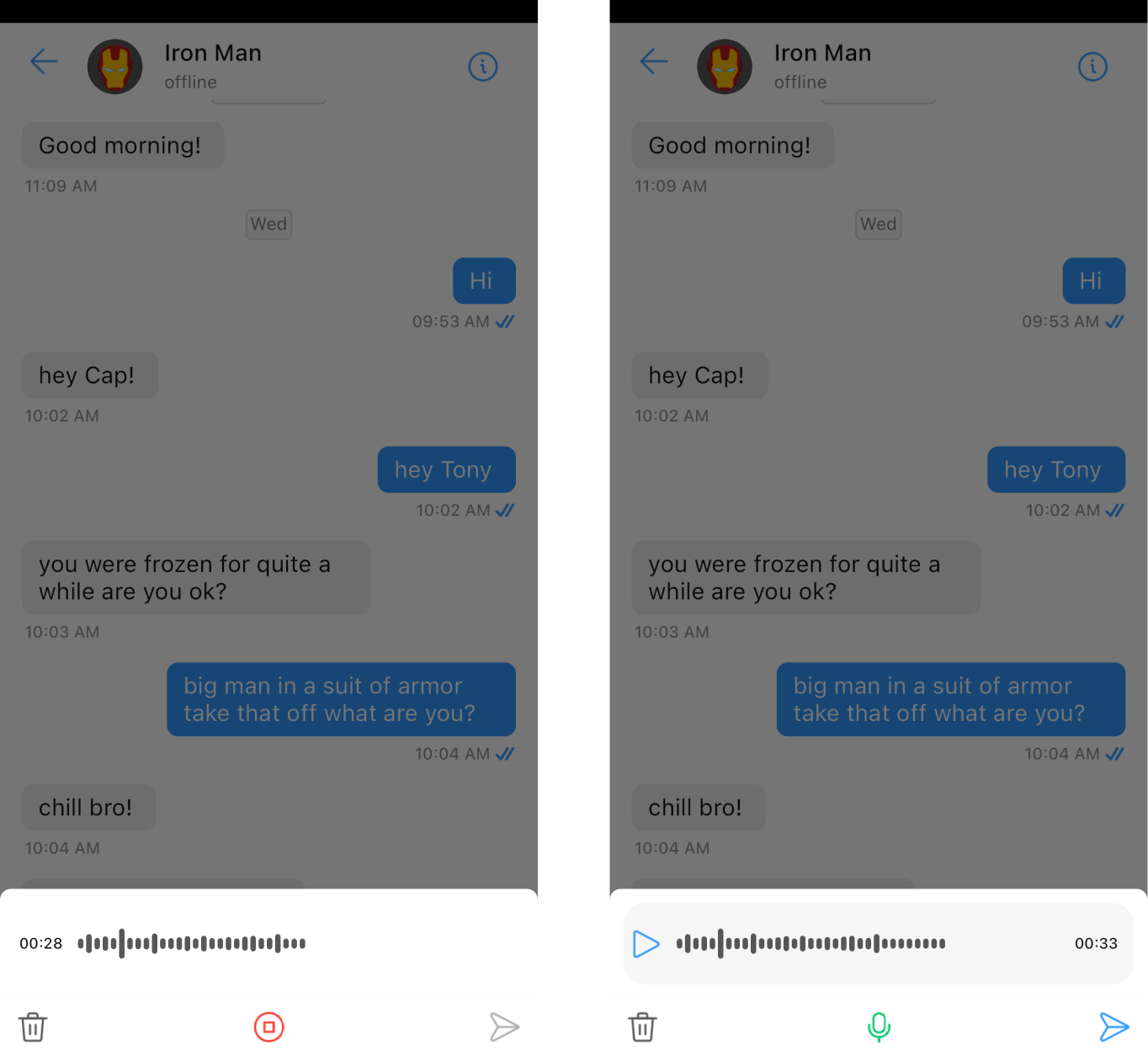 | submitIcon | Widget | provides icon to the start Icon/widget that utilizes the path audio recorded through the CometChatMediaRecorder |