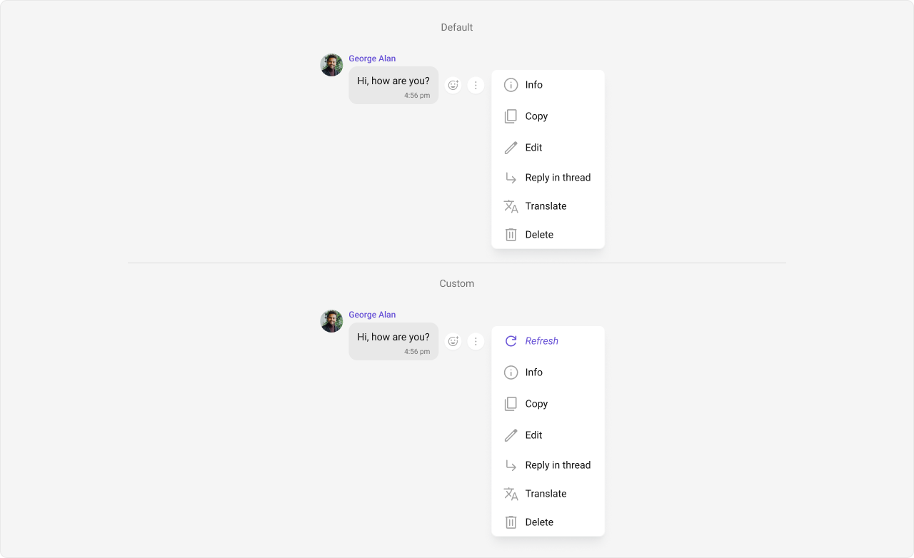 - Bottom view: This view can be used to extend the Message Bubble with additional elements, such as link previews or a ‘load more’ button for long messages. It’s typically placed beneath the Content view.