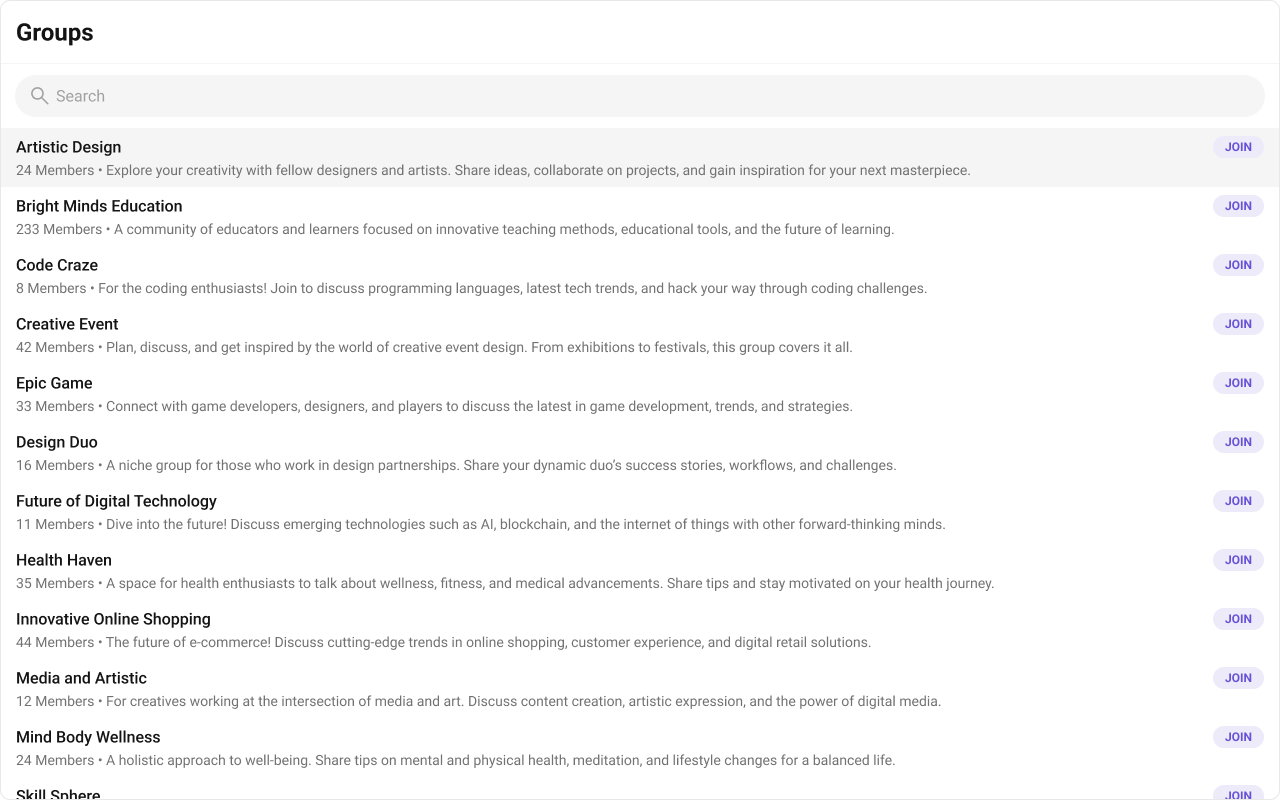 The Groups is a Component, showcasing an accessible list of all available groups. It provides an integral search functionality, allowing you to locate any specific groups swiftly and easily. For each group listed, the group name is displayed by default, in conjunction with the group icon when available. Additionally, it provides a useful feature by displaying the number of members in each group as a subtitle, offering valuable context about group size and activity level.